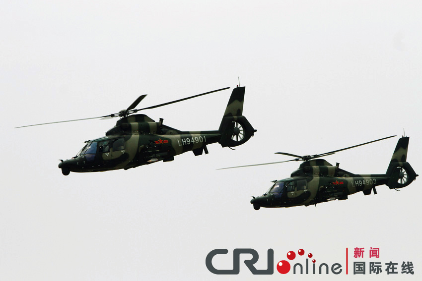解放軍直-9WZ武裝直升機進行飛行表演。戴爽 攝