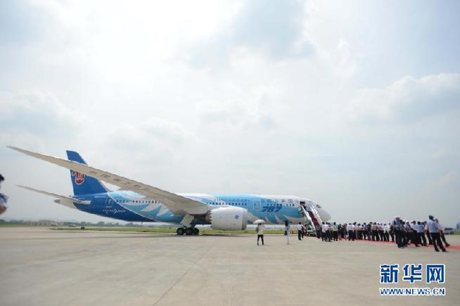 6月2日,南方航空公司在廣州白云機場舉辦接機儀式,宣布中國引進的首架波音787夢想飛機正式啟動運營。當日,我國引進的首架波音787夢想飛機飛抵廣州。 新華社記者 王建華 攝