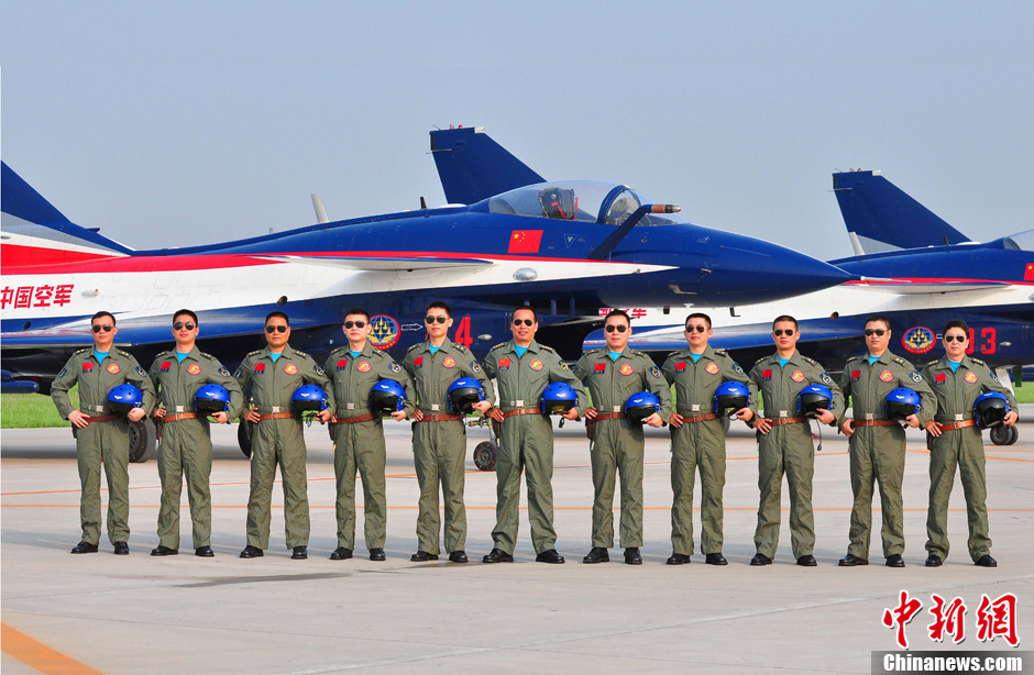 8月26日,中國空軍八一飛行表演隊在莫斯科拉緬斯科耶機場展開航展前的檢驗性飛行,當(dāng)日,中國空軍在莫斯科宣布,從8月30日至9月1日,八一飛行表演隊將在第十一屆莫斯科航展上進行3場飛行表演,準(zhǔn)備了三個表演方案、21個動作。每場實施哪個飛行表演方案,將視當(dāng)天氣象條件而定。備受關(guān)注的是,中國空軍同時披露了在莫斯科上空飛舞的11位飛行員名錄和角色,向國際友人介紹這些“藍天舞者”的風(fēng)格與風(fēng)采。圖為11名飛行員合影照片。中新社發(fā) 申進科 攝