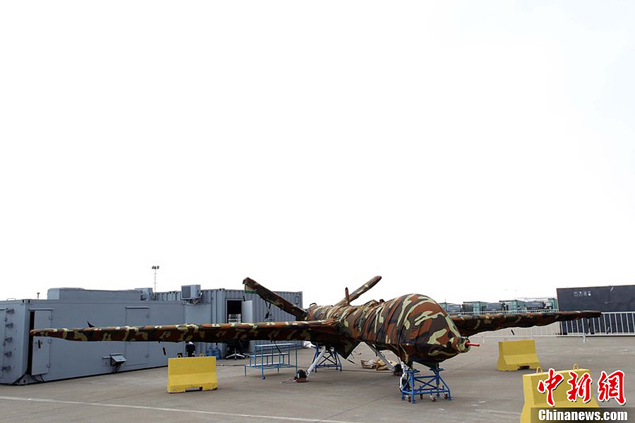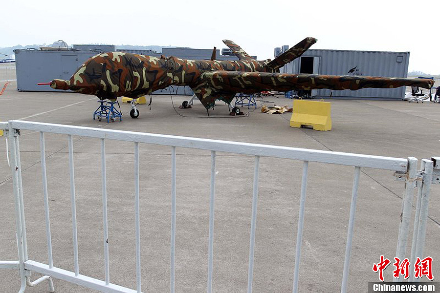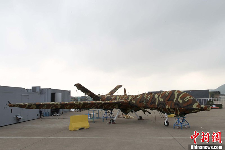 曾在前兩屆珠海航展上展出模型的翼龍無人機(jī),在今年航展上以實(shí)物參展。11月8日,該機(jī)已經(jīng)組裝完畢停放在展坪上。該款無人機(jī)由中航工業(yè)旗下成都飛機(jī)設(shè)計(jì)研究所研制,該機(jī)裝有一臺100馬力活塞發(fā)動機(jī),具備全自主平輪式起降和飛行能力,最大起飛重量達(dá)1100公斤,最大續(xù)航時(shí)間為20個(gè)小時(shí),可攜帶各種偵察、激光照射/測距、電子對抗設(shè)備及小型空地打擊武器,可執(zhí)行監(jiān)視、偵查及對地攻擊任務(wù)等任務(wù),也可用于維穩(wěn)、反恐、邊界巡邏等。