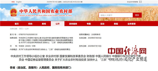 經(jīng)濟(jì)日?qǐng)?bào)-中國經(jīng)濟(jì)網(wǎng)北京7月14日訊 近日,中央農(nóng)辦、農(nóng)業(yè)農(nóng)村部、發(fā)展改革委、財(cái)政部、人民銀行、銀保監(jiān)會(huì)、證監(jiān)會(huì)等7部門聯(lián)合印發(fā)《關(guān)于擴(kuò)大農(nóng)業(yè)農(nóng)村有效投資 加快補(bǔ)上“三農(nóng)”領(lǐng)域突出短板的意見》(以下簡稱《意見》),部署擴(kuò)大農(nóng)業(yè)農(nóng)村有效投資,為打贏脫貧攻堅(jiān)戰(zhàn)和全面建成小康社會(huì)提供堅(jiān)實(shí)支撐。