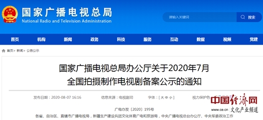 經(jīng)濟日報-中國經(jīng)濟網(wǎng)北京8月10日訊 近日,國家廣播電視總局公布7月份全國拍攝制作電視劇備案公示情況,據(jù)悉,2020年7月,全國電視劇拍攝制作備案公示的劇目共49部、1640集。