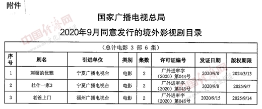 經(jīng)濟日報-中國經(jīng)濟網(wǎng)北京10月27日訊 26日,國家廣播電視總局辦公廳公布2020年9月全國引進境外影視劇有關情況,由寧夏廣播電視臺引進的《刺猬的優(yōu)雅》《杜什一家3》,福州廣播電視臺引進的《老爸上門》等3部電影,入選《2020年9月同意發(fā)行的境外影視劇目錄》。