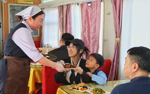 春運首日鐵路天津客運段值乘的T253次列車上餐車服務(wù)人員正在為旅客提供用餐服務(wù)。(楊寶森/攝)