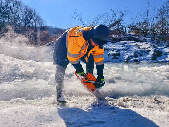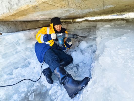 2月初的北方山區(qū),寒風(fēng)呼嘯,風(fēng)力達(dá)五級,氣溫逼近零下20攝氏度。職工們手持油鋸、電鎬破開冰層,由于橋下空間有限,職工們有時(shí)需要半跪或是半躺式,一層層的進(jìn)行破冰,然后再用鐵鍬將碎冰鏟至河道兩側(cè)。冰水混合物不斷濺到身上,迅速凝結(jié)成冰,不到半小時(shí),許多人外套已覆上一層白霜,成了名副其實(shí)的“冰人”。然而無人停歇,破冰動(dòng)作穩(wěn)健而持續(xù)。