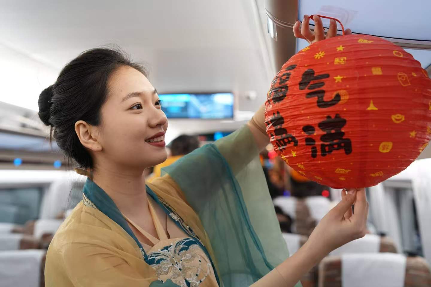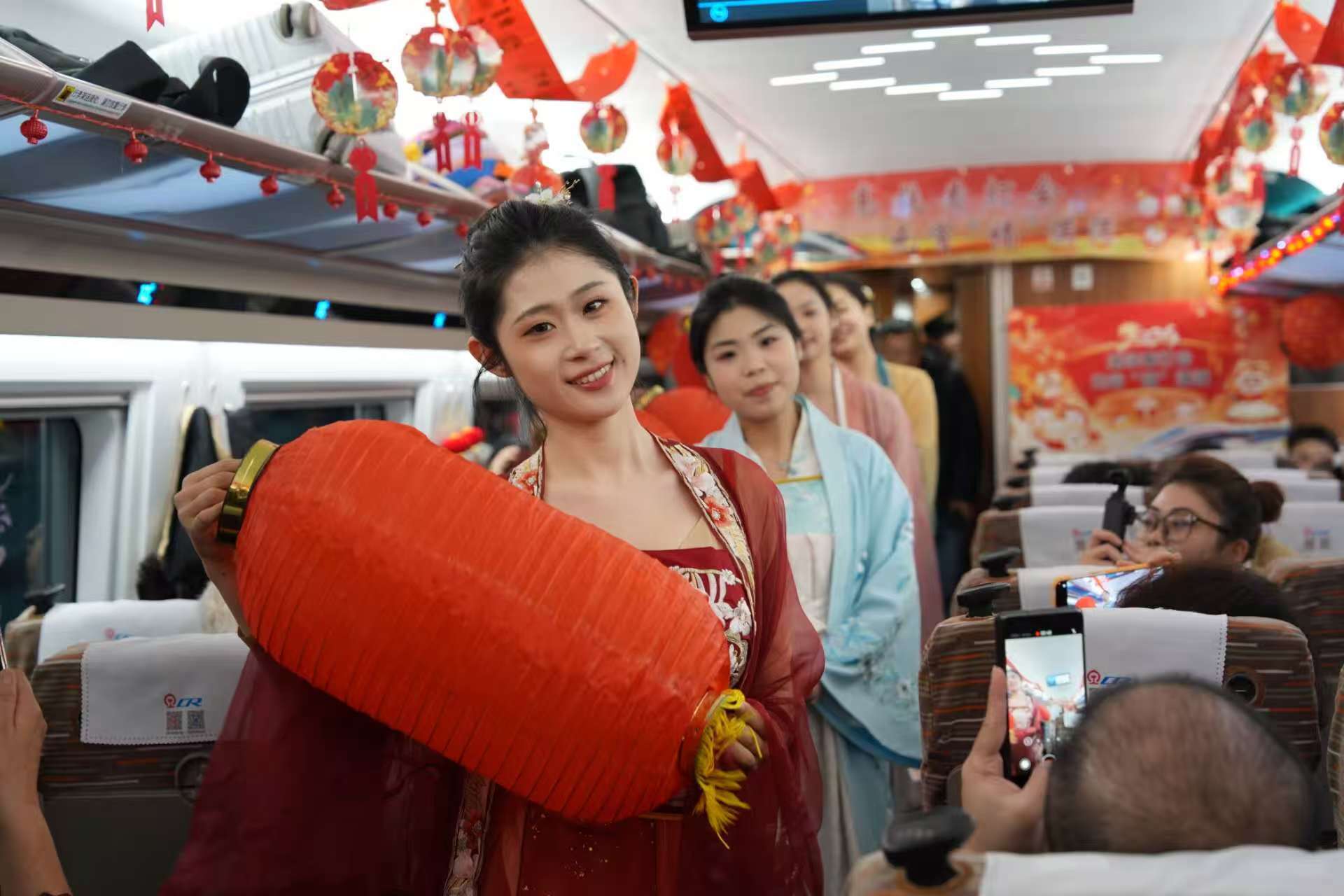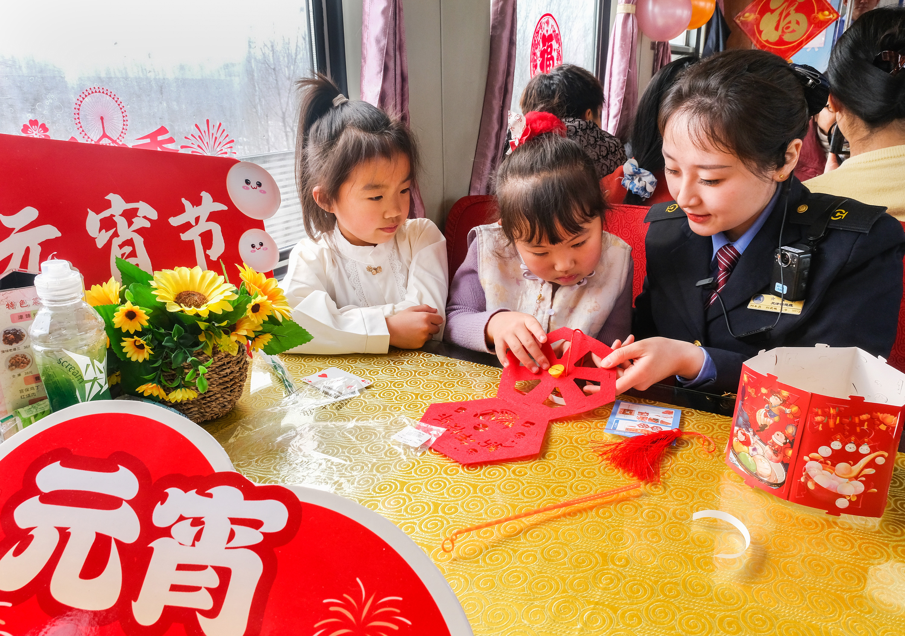 色彩鮮艷的拉花,交相輝映的燈籠,車廂處處洋溢著喜慶祥和的節(jié)日氣息,旅客剛進(jìn)入車廂,驚喜地發(fā)現(xiàn)仿佛置身移動(dòng)的“元宵喜樂會(huì)”。