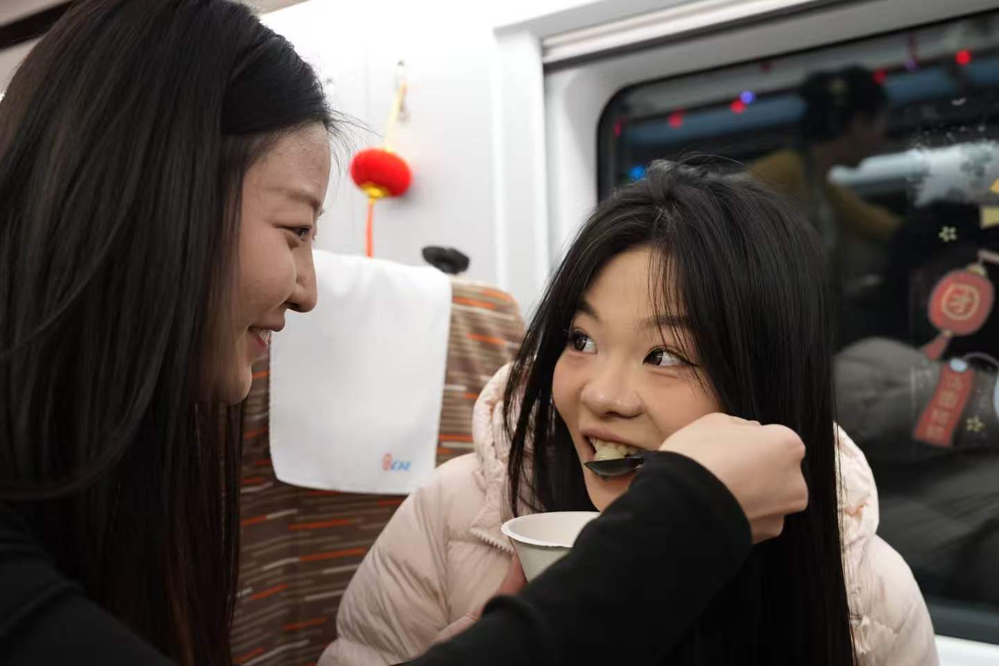 車廂內(nèi)喜慶的節(jié)日裝飾暖意濃濃。乘務(wù)人員為旅客表演相聲、舞蹈等文藝節(jié)目,與旅客互動(dòng)猜燈謎、做花燈、吃元宵,車廂里滿是歡笑與溫情。
