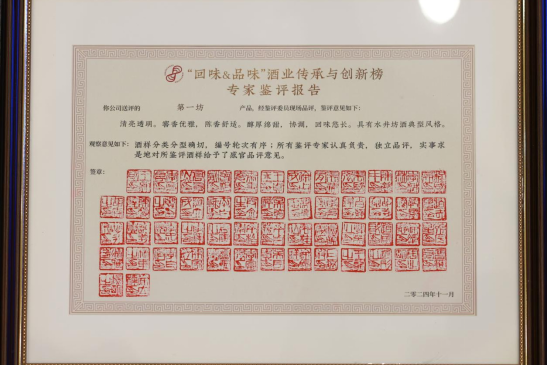 “清亮透明。窖香優(yōu)雅,陳香舒適。醇厚綿甜,協(xié)調(diào),回味悠長(zhǎng)。具有水井坊酒典型風(fēng)格?!薄盎匚?amp;品味”酒業(yè)傳承與創(chuàng)新榜專家鑒評(píng)報(bào)告也給予水井坊“第一坊”高度評(píng)價(jià)。