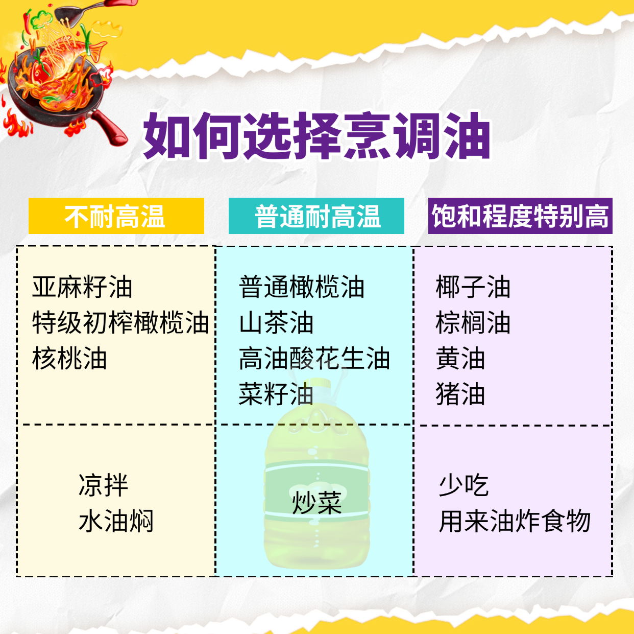市面上的烹調油多種多樣,該如何選擇?曹展表示,不耐高溫的烹調油,如亞麻籽油、特級初榨橄欖油、核桃油等,可以用來涼拌、水油燜;普通耐高溫的烹調油,如普通橄欖油、山茶油、高油酸花生油、菜籽油等,可以用來炒菜;飽和程度特別高的烹調油,如椰子油、棕櫚油、黃油、豬油等,首先要少吃,如果有需要,可以偶爾用來油炸食物。