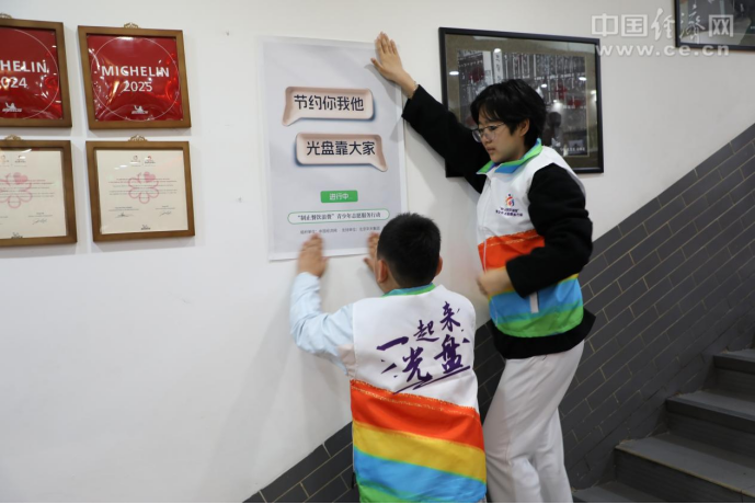活動(dòng)中,“制止餐飲浪費(fèi)”青少年志愿者們首先將宣傳節(jié)約糧食、反對(duì)浪費(fèi)的標(biāo)語海報(bào)張貼在餐廳顯著位置。