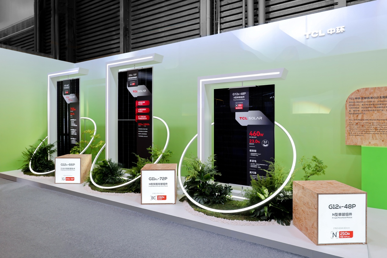 其中,TCL中環(huán)攜G12光伏硅片、TOPCon多分片高效組件、BC高效組件等創(chuàng)新成果參展。目前TCL光伏組件矩陣布局完善,可精準(zhǔn)滿足戶用、工商業(yè)屋頂、大型地面電站(沙漠、戈壁、荒山)以及特殊承重受限場(chǎng)景等多元化客戶需求。