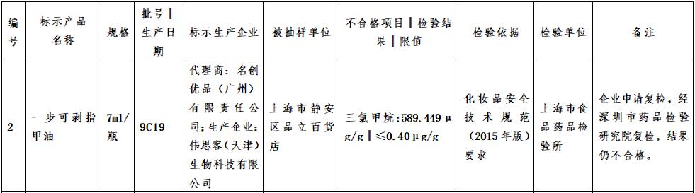 經(jīng)濟日報-中國經(jīng)濟網(wǎng)9月25日訊(記者 韓璐) 上海市藥品監(jiān)督管理局23日發(fā)布的抽檢公告顯示,由名創(chuàng)優(yōu)品(廣州)有限責(zé)任公司代理的指甲油添加禁用物質(zhì)三氯甲烷,并且經(jīng)企業(yè)申請復(fù)檢后結(jié)果仍不合格。 檢驗結(jié)果顯示,該產(chǎn)品中三氯甲烷的含量高達589.449μg/g,相比《化妝品安全技術(shù)規(guī)范》(2015年版)中規(guī)定的檢測限值超標(biāo)1400多倍。