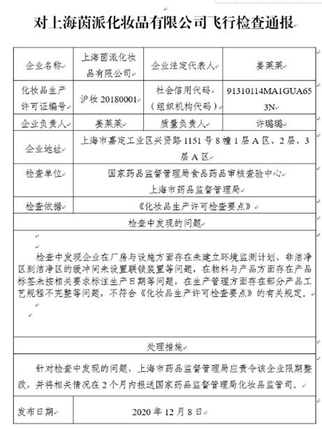 中國(guó)經(jīng)濟(jì)網(wǎng)北京12月10日訊(記者 朱國(guó)旺 楊奇奇) 12月8日,國(guó)家藥監(jiān)局發(fā)布的對(duì)上海茵派化妝品有限公司飛行檢查通報(bào)顯示,該企業(yè)不符合《化妝品生產(chǎn)許可檢查要點(diǎn)》的有關(guān)規(guī)定。據(jù)國(guó)產(chǎn)非特殊用途化妝品化妝品備案平臺(tái)顯示,該公司為東方寶石、俊平、搖滾動(dòng)物園、樂(lè)嬰堂、紅地球、稚優(yōu)泉等化妝品品牌的生產(chǎn)企業(yè)。