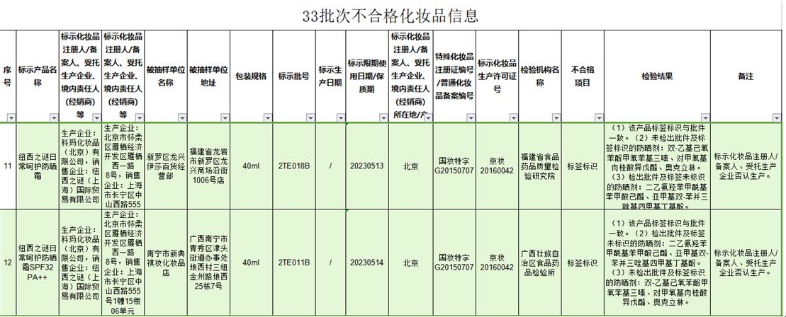 通告顯示,經(jīng)福建省食品藥品質(zhì)量檢驗研究院及廣西壯族自治區(qū)食品藥品檢驗所檢驗,生產(chǎn)企業(yè)為科瑪化妝品(北京)有限公司,銷售企業(yè)為紐西之謎(上海)國際貿(mào)易有限公司生產(chǎn)的紐西之謎日常呵護(hù)防曬霜、紐西之謎日常呵護(hù)防曬霜SPF32 PA++產(chǎn)品不合格。