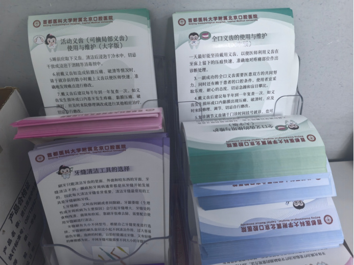 記者走進北京口腔醫(yī)院門診樓,綠色的“老年咨詢臺”標示映入眼簾。老年咨詢臺正前方走20米,左手邊便是老年口腔病科。順著黃色地標徑直走約30米,便到達分診臺。上午的分診臺前,是患者最多的時候,詢問聲和指引聲交織,忙而有序。分診臺一角的老花鏡和大字版宣教彩頁引人矚目。護士告訴記者,這是為老年患者特意準備的。“科室建的時間長,我們也準備搬新院了,雖然地方有點局促,但該有的硬件都有?!?/p>