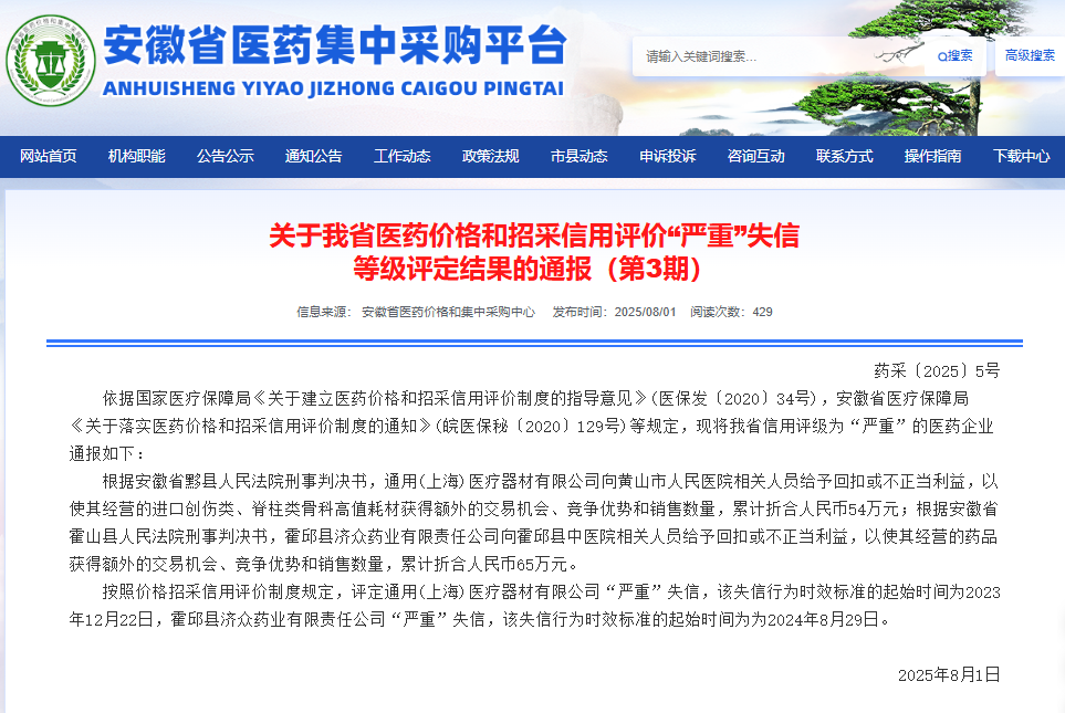 通報(bào)顯示,根據(jù)安徽省黟縣人民法院刑事判決書,通用(上海)醫(yī)療器材有限公司向黃山市人民醫(yī)院相關(guān)人員給予回扣或不正當(dāng)利益,以使其經(jīng)營的進(jìn)口創(chuàng)傷類、脊柱類骨科高值耗材獲得額外的交易機(jī)會、競爭優(yōu)勢和銷售數(shù)量,累計(jì)折合人民幣54萬元;按照價(jià)格招采信用評價(jià)制度規(guī)定,評定通用(上海)醫(yī)療器材有限公司“嚴(yán)重”失信,該失信行為時(shí)效標(biāo)準(zhǔn)的起始時(shí)間為2023年12月22日。
