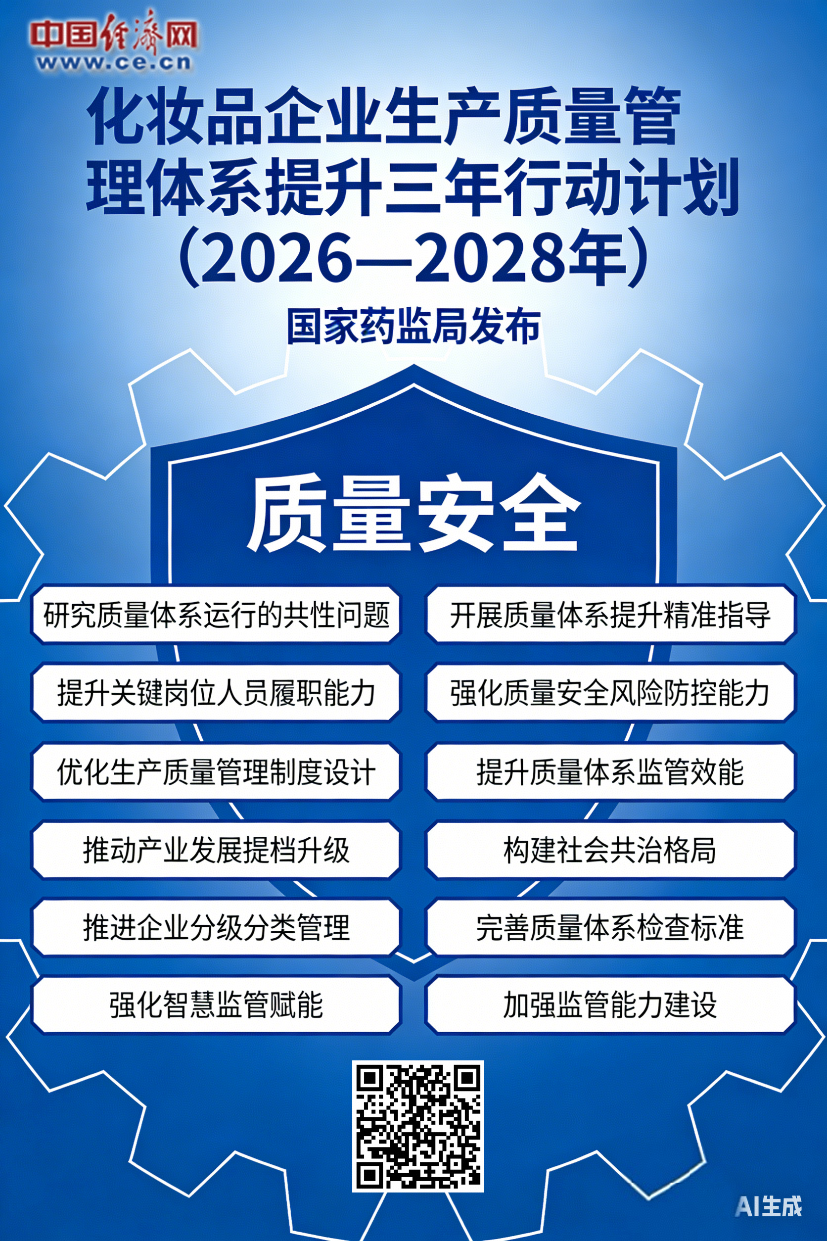 中國(guó)經(jīng)濟(jì)網(wǎng)12月12日訊(記者 郭文培)12月12日,國(guó)家藥監(jiān)局綜合司發(fā)布《化妝品企業(yè)生產(chǎn)質(zhì)量管理體系提升三年行動(dòng)計(jì)劃(2026—2028年)》。該行動(dòng)計(jì)劃共有12項(xiàng)重點(diǎn)任務(wù),通過開展質(zhì)量體系提升行動(dòng),到2028年底,化妝品企業(yè)主體責(zé)任意識(shí)全面增強(qiáng),質(zhì)量體系運(yùn)行水平整體提升,企業(yè)關(guān)鍵崗位人員履職能力顯著提高,企業(yè)質(zhì)量安全管理水平和風(fēng)險(xiǎn)防控能力持續(xù)優(yōu)化,化妝品監(jiān)管專業(yè)化水平不斷加強(qiáng),企業(yè)負(fù)責(zé)、政府監(jiān)管、行業(yè)自律、公眾參與、媒體監(jiān)督、法治保障的社會(huì)共治格局基本形成,化妝品行業(yè)創(chuàng)新力、競(jìng)爭(zhēng)力、品牌力明顯提升。