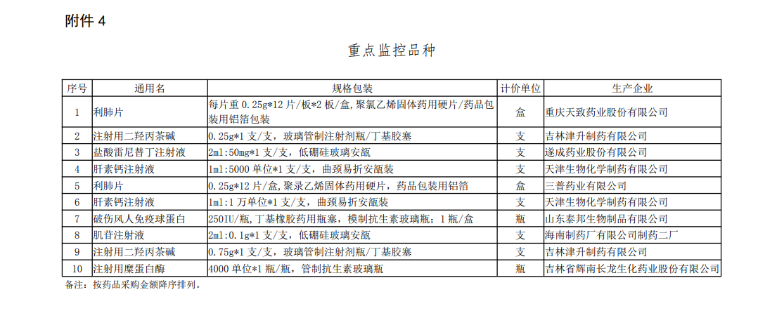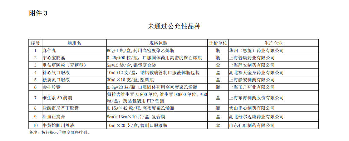 譬如,新申請(qǐng)超“黃線”品種名單中,北京同仁堂科技發(fā)展股份有限公司制藥廠麻仁潤(rùn)腸軟膠囊、云南白藥集團(tuán)股份有限公司云南白藥氣霧劑系獨(dú)家品種;原在庫(kù)超“黃線”品種名單中,浙江泰利森藥業(yè)有限公司瑞格列奈二甲雙胍片(II)是獨(dú)家品種;未通過公允性品種名單中,湖北福人金身藥業(yè)有限公司補(bǔ)心氣口服液、上海玉丹藥業(yè)有限公司參桂膠囊是獨(dú)家品種;重點(diǎn)監(jiān)控品種名單中,吉林津升制藥有限公司注射用二羥丙茶堿為獨(dú)家品種。