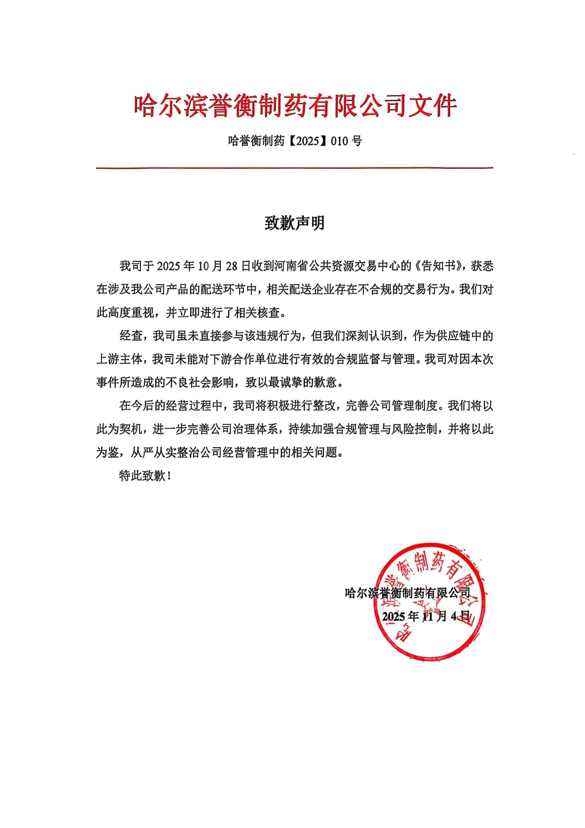 根據(jù)公開致歉信,在涉及哈爾濱譽衡制藥有限公司產(chǎn)品的配送環(huán)節(jié)中,相關配送企業(yè)存在不合規(guī)的交易行為。吉林四環(huán)制藥有限公司生產(chǎn)的產(chǎn)品“腦苷肌肽注射液”,其合作配送企業(yè)在河南省存在不合規(guī)交易行為。珠海經(jīng)濟特區(qū)粵康醫(yī)藥有限公司注射用頭孢呋辛鈉代理商,在河南省發(fā)生不合規(guī)交易行為,粵康醫(yī)藥收到河南省公共資源交易中心下發(fā)的《醫(yī)藥價格和招采信用失信等級評定告知書》失信等級預評定為特別嚴重失信。