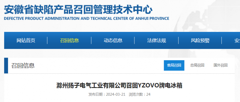 日前,滁州揚(yáng)子電氣工業(yè)有限公司按照《消費(fèi)品召回管理暫行規(guī)定》的要求,向安徽省市場監(jiān)督管理局、滁州市市場監(jiān)督管理局報告了召回計(jì)劃,將自即日起,召回2023年8月21日至2023年10月7日期間生產(chǎn)的YZOVO牌電冰箱(BCD-72P148),涉及數(shù)量為50臺。