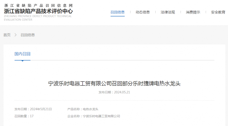 日前,寧波樂時電器工貿有限公司受缺陷調查影響按照《消費品召回管理暫行規(guī)定》的要求,主動向浙江省市場監(jiān)督管理局和寧波市市場監(jiān)督管理局報告了召回計劃,將自即日起,召回2023年5月27日至2023年5月28日期間制造的樂時捷牌ST1X3型號電熱水龍頭,涉及數(shù)量為17件。