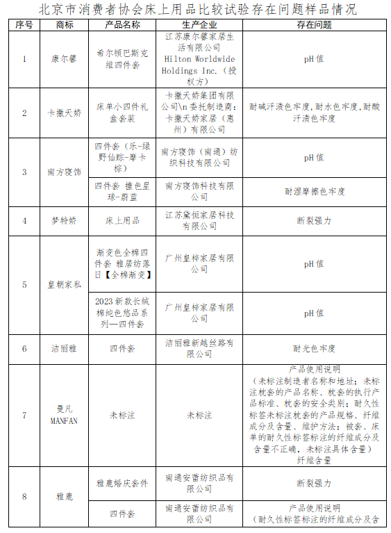 近日,北京市消費(fèi)者協(xié)會(huì)發(fā)布床上用品比較試驗(yàn)結(jié)果,經(jīng)檢測(cè),80件樣品中,雅鹿、無(wú)印良品等15個(gè)品牌的樣品存在不符合標(biāo)準(zhǔn)問(wèn)題,問(wèn)題主要集中在產(chǎn)品使用說(shuō)明、斷裂強(qiáng)力、纖維含量、pH值、色牢度、起球性能、甲醛含量等檢測(cè)項(xiàng)目。