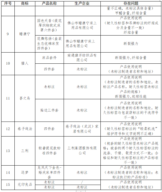 試驗(yàn)發(fā)現(xiàn),遠(yuǎn)夢(mèng)、巷子戲法、三利、雅鹿、喜之鳥(niǎo)、無(wú)印良品、睡康寧、貓人、曼凡MANFAN的11件樣品產(chǎn)品使用說(shuō)明不規(guī)范或不正確。產(chǎn)品使用說(shuō)明標(biāo)簽應(yīng)包括產(chǎn)品名稱、產(chǎn)品號(hào)型或規(guī)格、纖維成分及含量、維護(hù)方法、執(zhí)行的產(chǎn)品標(biāo)準(zhǔn)、安全類別、制造者信息等信息。該11件樣品的標(biāo)識(shí)信息出現(xiàn)未標(biāo)注制造者名稱和地址、未標(biāo)注執(zhí)行的產(chǎn)品標(biāo)準(zhǔn)、耐久性標(biāo)簽未標(biāo)注產(chǎn)品號(hào)型或規(guī)格、合格證或耐久性標(biāo)簽標(biāo)注不正確或不一致等問(wèn)題。產(chǎn)品使用說(shuō)明不規(guī)范或不正確,會(huì)影響消費(fèi)者正確選購(gòu)或使用床上用品。