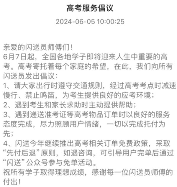 此外,閃送也向全國(guó)超過(guò)255萬(wàn)閃送員發(fā)出倡議,號(hào)召騎手在高考期間文明騎行,主動(dòng)向考生和家長(zhǎng)提供幫助,用最好的精神面貌服務(wù)用戶,為高考加油。