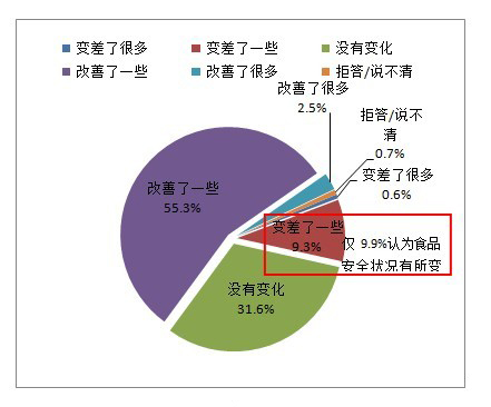 過去一年,國(guó)家多個(gè)部門發(fā)布了食品行業(yè)的新政策與新法規(guī),對(duì)食品工業(yè)行業(yè)嚴(yán)加把關(guān),多數(shù)市民也認(rèn)為食品安全狀況得到了改善。55.3%的市民認(rèn)為食品安全狀況改善了一些,2.5%的市民認(rèn)為食品安全狀況改善了很多,而在2011年只有35.4%的受訪者認(rèn)為食品安全狀況在過去一年有所改變,2012年比2011年提升19.9%。