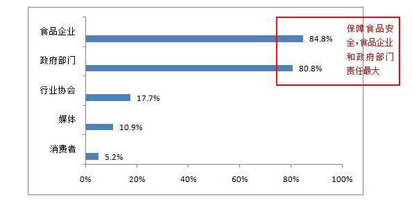 在保障食品安全的責(zé)任問題上,84.8%的市民認(rèn)為食品企業(yè)責(zé)任最大,80.8%的市民認(rèn)為政府部門責(zé)任最大,行業(yè)協(xié)會(huì)、媒體、消費(fèi)者也被認(rèn)為負(fù)有一定的責(zé)任,但比重較小,分別為17.7%、10.9%和5.2%。