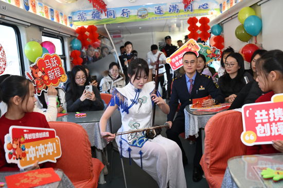 文藝表演環(huán)節(jié)精彩迭出,為旅途注入鮮活氣息。一曲《美麗家園》唱出游子對(duì)故鄉(xiāng)的深情眷戀,喚起旅客心中共同的團(tuán)圓情結(jié);舞蹈《草原花正開》以舒展的舞姿、明快的節(jié)奏,勾勒出草原的遼闊生機(jī),仿佛提前帶來(lái)春的氣息;二胡獨(dú)奏《賽馬》激昂奔放,弦音如蹄,奏響新春的蓬勃朝氣,引來(lái)陣陣掌聲;《烏蘭巴托的夜》深情悠遠(yuǎn),撫慰旅途思念,增添一抹詩(shī)意的溫暖;最后的器樂彈唱《奔跑》以熟悉旋律點(diǎn)燃全場(chǎng),傳遞出向前奮進(jìn)的青春力量。