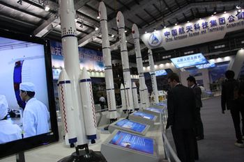 即將于2014年實(shí)現(xiàn)首飛的新一代大運(yùn)載火箭“長(zhǎng)征五號(hào)”模型高高地矗立著!伴L(zhǎng)二F”、“長(zhǎng)三甲”、“長(zhǎng)四乙”等白色箭體模型緊隨其后,一字排開,場(chǎng)面蔚為壯觀。很多電視媒體在采訪時(shí),都有意識(shí)地將長(zhǎng)征火箭或者“天宮一號(hào)”的模型作為背景。